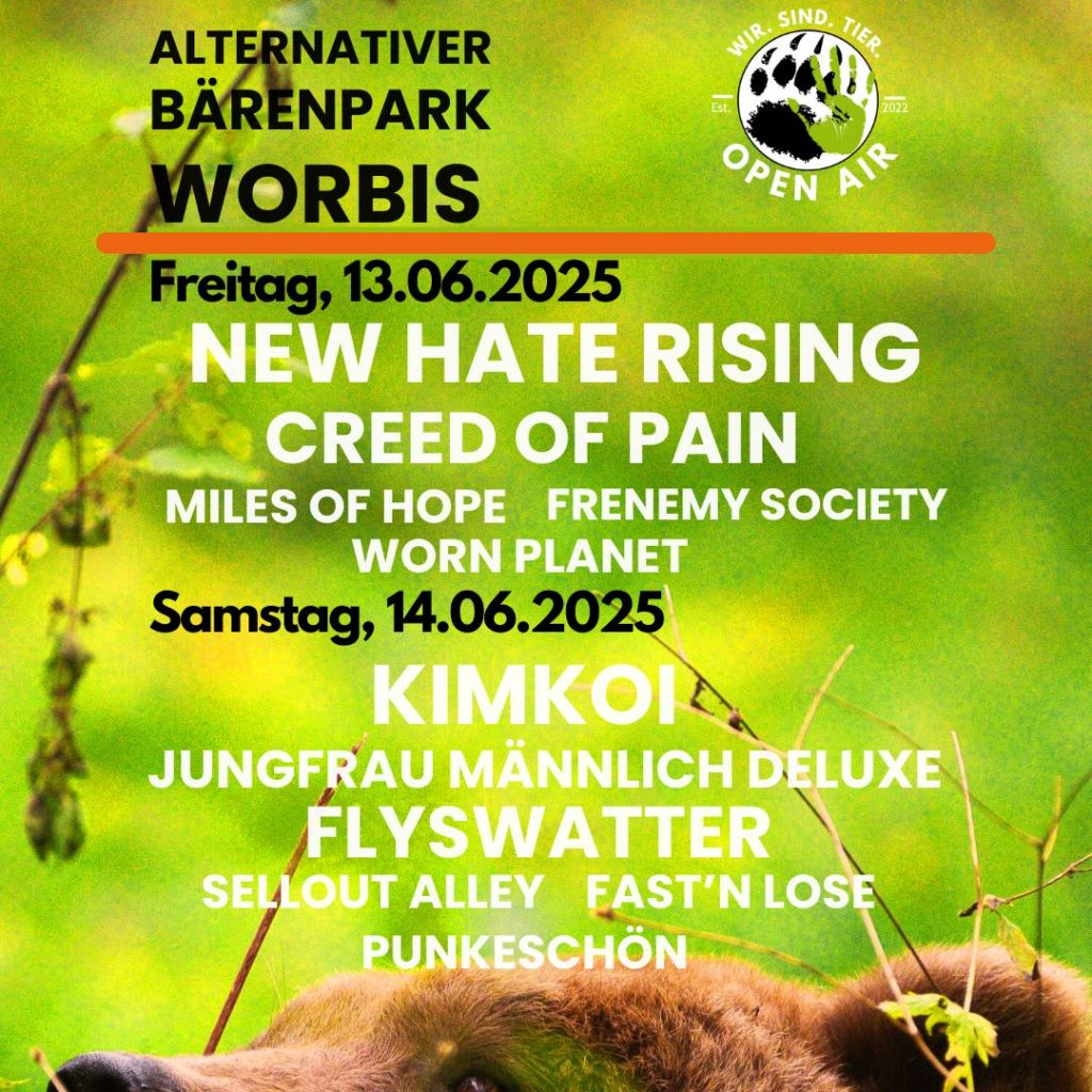 Wenn Ihr unser Festival vom 13.-15.06.2025 besucht könnt ihr nicht nur leidenschaftliche Musikerinnen und Musiker genießen, sondern unterstützt auch aktiv den Tierschutz. Außerdem werden zahlreiche Organisationen und Akteure aus dem Umwelt- und Artenschutz mit interaktiven Infoständen vertreten sein sowie ein Überraschungs-Kinderprogramm am Sonntag. Das Frühbucherticket ist für bärenstarke 15,- Euro direkt an der Kasse vom Alternativen Bärenpark Worbis erhältlich und beinhaltet ein Abendticket für Freitag und Samstag sowie Tagestickets für den Bärenpark am 14. und 15.06.2025.